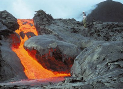 Certains volcans produisent des laves très fluides qui coulent sur de grandes surfaces et donnent des reliefs en pentes douces. Ce sont les volcans boucliers. C'est la composition chimique des laves qui donne sa fluidité. Parfois, la lave est évacuée à partir de fractures de l'écorce terrestre ouvertes par l'activité tectonique. A la surface elle s'épanche de part et d'autre de la fissure en fleuves basaltiques. Il n'y a pas dans ce cas de conduit conduit principal. On parle d'éruption fissurale. |