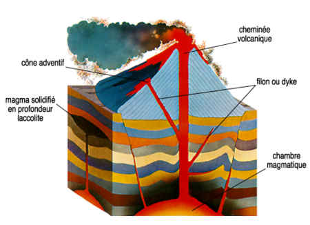 d'une ouverture appelée cratère. Le volcan surmonte une cheminée (fissure dans l'écorce terrestre) d'où jaillissent des gaz, de la vapeur et des matières brûlantes |